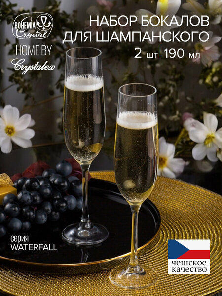 Набор фужеров для шампанского Crystalex Bohemia Waterfall 190 мл(6 шт)68 x 68 x 238мм В набор утонченных и легких фужеров для дегустации и подачи шампанского входит 6 изделий. Отличительная и характерная особенность серии Waterfall, которая представлена вашему вниманию, является полное отсутствие гравировки и дополнительных элементов декора. Ничего лишнего, только тончайшее и прозрачное стекло чаши фужера, тонкая высокая ножка и устойчивое основание круглой классической формы. Чешский бренд Crystalite Bohemia представляет изделия, качество и презентабельный внешний вид которых даже после длительного использования гарантирует. Эти бокалы станут прекрасный подарком девушке, подруге, жене, маме, бабушке на 14 февраля, 8 марта.