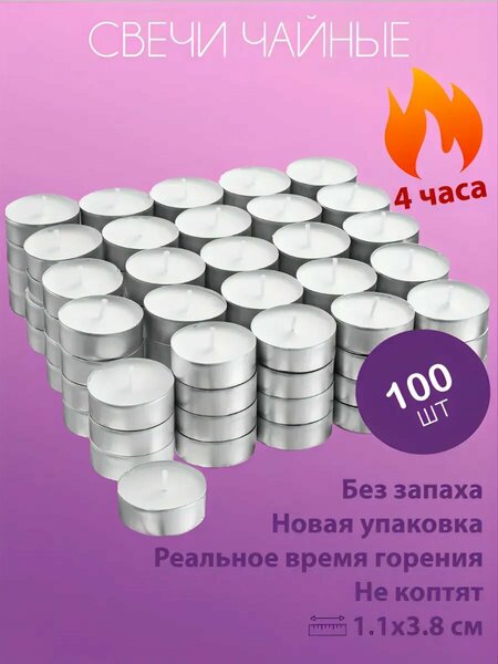 Среднее время горения 4 часа. Смотрите ускоренное видео с замерами горения. Греющие свечки таблетки для гадания без запаха подходят для аромалампы, для фондю, для чайников в качестве подогрева и поддержания температуры чая на чайной церемонии. Свечи плавающие - удерживаются на воде. Чайная свеча прекрасно смотрится в подсвечниках - домиках, в китайских светильниках - фонариках, впишутся в интерьер в стиле ikea. Идеальны для медитации, расслабления и релакса. Круглые маленькие свечи в форме таблетки плавают на воде, подойдут для принятия ванны и создания романтической атмосферы на ужин при свечах, для свидания, предложения. Свечки для массажа. Настольные белые свечи отличное дополнение интерьера дома, на кухне, создадут тепло и уют в комнате. Мерцание настольной свечи создаст располагающую магическую атмосферу, превратит ужин в романтический и украсит праздничный стол. Натуральная свеча создаст праздничную рождественскую и новогоднюю атмосферу Парафиновые декоративные свечки для подсвечника идеально подойдут для оформления интерьера и освещения комнаты, украсят новогодний стол. Горят аккуратно, не текут, не трещат. Массажные экономичные свечи, прогорают до конца. Упаковка свеч подойдет в подарок. 100 шт. Свеча для мармита подойдет для подогрева блюд. Состав: парафин, алюминий, хлопок.