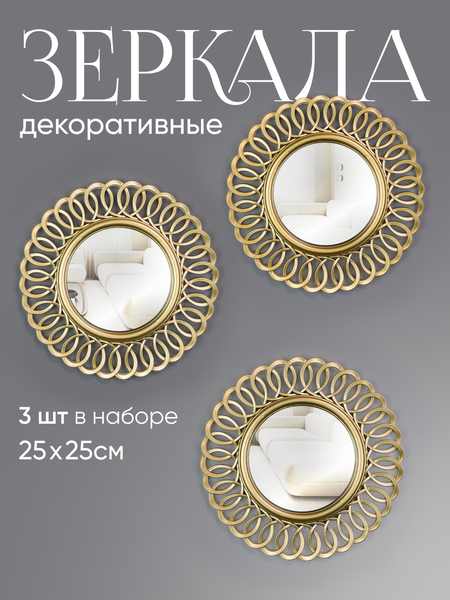 Зеркало настенное Интерьерное Solmax, Круглое в раме, Лофт, Дизайнерское набор из 3 шт. Solmax, цвет шампань