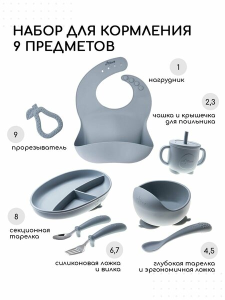 Набор для кормления силиконовый из 9 предметов подходит для детей от 4 месяцев до 7 лет. Комплект включает: тарелку на присоске, кружку - непроливайку с крышкой и трубочкой, нагрудник с большим кармашком, секционную тарелку для раздельного питания с высокими бортиками. Силиконовая посуда детская подходит для новорожденных девочек и мальчиков, для их кормящих мам, которые будут помогать малышам приобрести навыки аккуратного питания. Тарелочка на присоске, куда можно положить вкусную кашу, имеет безопасные закругленные края и надежно фиксируется, что обеспечивает безопасность и предотвращает опрокидывание. Секционная тарелка - мисочка выполнена с разными отделениями, ограниченными стенками - разделителями для сортировки пищи, в них удобно положить разные продукты, что выглядит эстетично и способствует повышению аппетита у малыша. Глубокий стаканчик - кружка овальной формы с дополнительной крышкой и отверстием для трубочек удобен для молока, молочных и фруктовых напитков. Силиконовый нагрудник для кормления имеет большой кармашек, крепление с кнопками и отверстиями позволяет адаптировать размер под шею ребенка, удобный, защищающий одежду ребенка фартук, используют вместо слюнявчика. Ложка для кормления безопасна для детских десен и зубов. Детская ложечка для кормления имеет небольшой объем, ее можно кусать и жевать вместо грызунка, мягкое покрытие не травмирует десны. Детский набор посуды подходит для самостоятельного приема пищи малышом. Кухонные столовые приборы можно ставить в микроволновую печь (микроволновку) для разогрева еды. Их можно мыть в посудомоечной машине и положить в холодильник на кухне. Силиконовый набор для кормления удобно брать с собой в дорогу и путешествие на автомобиле или автобусе, в поезде или самолете, для отдыха на даче или пикника на свежем воздухе на природе. Идеальный для первого прикорма набор из легких и удобных компонентов - аксессуаров в подарочной упаковке - практичный подарок на годик, для мамы и малыша. Сертифицировано в России.