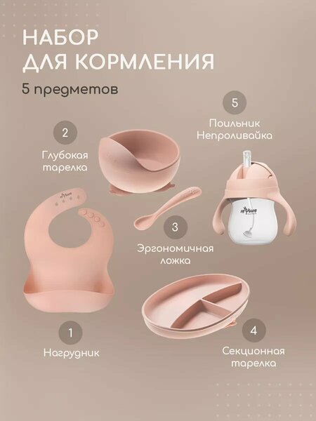 Познакомьтесь с нашим уникальным набором для кормления малышей! Включает в себя всю необходимую детскую посуду для прикорма и кормления - от ложки до тарелочек, подходит для детей от 4 месяцев до 7 лет. Комплект включает: тарелку на присоске, кружку - непроливайку с крышкой и трубочкой, нагрудник с большим кармашком, секционную тарелку для раздельного питания с высокими бортиками. Наш набор детской посуды изготовлен из безопасного силикона, который легко моется и не содержит вредных веществ. С этим набором ваш ребенок будет получать все необходимые питательные вещества с комфортом и удовольствием. Подарите своему малышу лучшее - выберите набор для кормления силиконовый прямо сейчас! Важно ! Стерилизовать выше 100 градусов можно только силиконовую посуду без приборов ! Приборы обдать кипятком , стерилизовать и греть в СВЧ приборы для кормления нельзя!