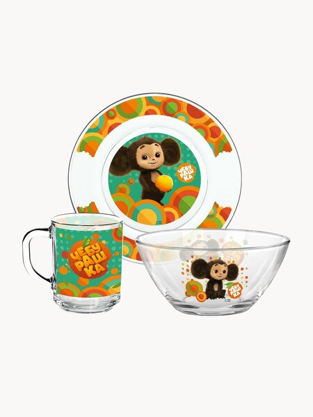 Красивый стеклянный набор посуды для кормления малышей включает три предмета с ярким рисунком Чебурашки. В комплект входят: детская тарелка диаметром 19,5 см, кружка объемом 230 мл и салатник 13 см — все необходимое для одной персоны. Посуда подходит для завтрака, обеда и прикорма маленьких детей, создана специально для использования дома. Столовая посуда с милыми и любимыми героями поднимет настроение мальчикам и девочкам благодаря привлекательному дизайну. Изделия изготовлены из качественного стекла по официальной лицензии — это гарантия безопасности и долговечности. Следует помнить, что использовать набор нельзя в СВЧ и ПММ. Мыть без абразивных моющих средств. Также в боковине коробки предусмотрена вырезаемая закладка, которая станет приятным дополнением. Подарочные наборы детской посуды станут отличным решением для детского стола и помогут организовать процесс еды удобно и красиво.