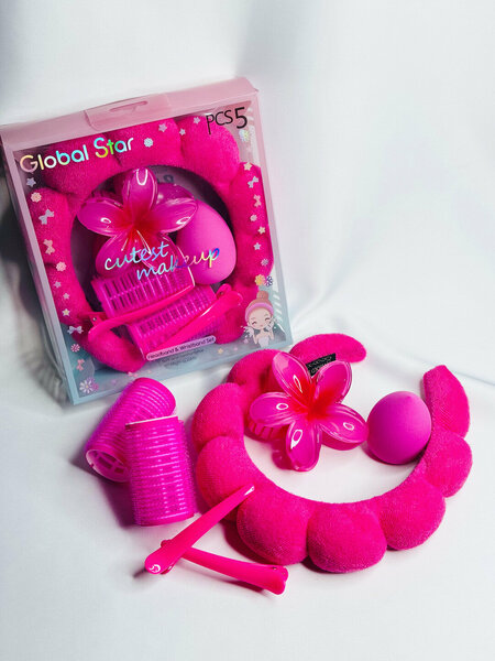 Бьюти-набор из 5 аксессуаров • Мягкая повязка • Бьюти-блендер • 2 бигуди • Зажим-краб + фиксирующие клипсы ✨ Удобен для макияжа, умывания, нанесения масок и ежедневного ухода. Аккуратно фиксирует волосы и помогает создать ухоженный образ. Подходит как подарок!