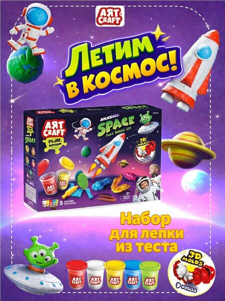Готовимся к полету в Космос вместе с ТМ "AЯT CRAFT". Для этого все необходимое есть в наборе. Мягкое пластичное тесто не липнет к рукам и хорошо формируется. Моделируем, фантазируем, смешиваем - все что так любят дети! Тесто безопасно для детей и не токсично. в наборе: тесто 5 цветов по 56г, формы 6 шт, инструменты 3 шт. Состав теста для лепки: мука, соль, вода, пищевые красители. Подходит для детей от 3 лет.