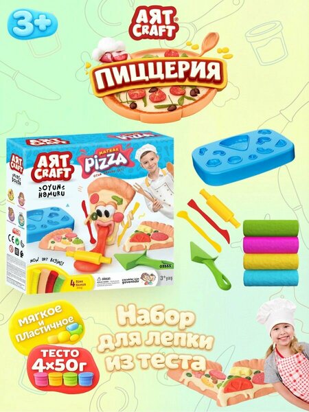 Увлекательный набор для лепки от ТМ "AЯT CRAFT". Открываем пиццерию и фантазируем! Мягкое пластичное тесто не липнет к рукам и хорошо формируется. Моделируем, фантазируем, смешиваем - все что так любят дети! в наборе: тесто 4 цвета по 50г, пластиковые формы 6 шт, инструменты 1 шт. Тесто безопасно для детей и не токсично. Состав теста для лепки: мука, соль, вода, пищевые красители. Подходит для детей от 3 лет.