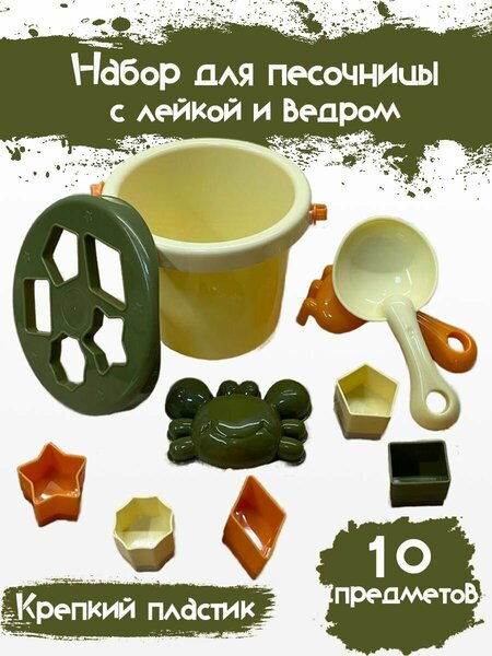 Погрузитесь в мир веселья и творчества с нашим песочным набором, который приносит радость и удовольствие вашему малышу на пляже или в песочнице! В комплект входит все необходимое для создания удивительных песочных шедевров, 10 предметов: Ведёрко-замок объемом 1,5 литра, чтобы ваш ребенок мог собирать песок и создавать свои уникальные конструкции. Лопатка длиной 17 см и грабли длиной 15 см для удобного моделирования и декорирования песочных форм. 1 формочка размером 11,5 см, 5 фигурок-сортеров чтобы создавать разнообразные фигуры и образцы в песке. Этот набор не только развлечет вашего малыша, но и поможет развить его творческие способности и моторику. С удобной упаковкой в виде сетки, вы легко сможете взять его с собой в любое место: на пляж, в парк или на дачу. Изготовленный из прочного пластика, наш песочный набор гарантирует долговечность и безопасность для вашего малыша. Элементы набора отличаются безопасным дизайном: без острых краев и мелких деталей, они изготовлены из качественной пластмассы, которая не содержит вредных веществ. Благодаря прочному пластику они обеспечивают безопасное и долговечное использование. Легко чистятся и быстро сохнут после мытья, что делает процесс ухода за ними простым и удобным. Погрузитесь в веселую игру с нашим песочным набором прямо сейчас!