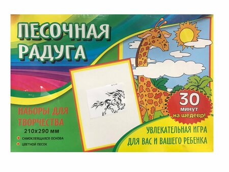Увлекательная игра для вас и вашего ребенка! Картинка из песка "Лошадь" это интересное и полезное занятие для вашего ребенка. Развивает логику, моторику рук и творческое мышление. Как сделать картинку из песка:- Отделите защитный слой с элементов одного цвета- Насыпьте песок на липкий слой- Переверните картинку и стряхните излишки песка Размер: 210х290Состав набора: самоклеящаяся основа, цветной песок.