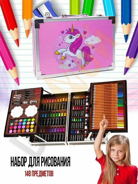 Набор для рисования в чемоданчике (для детей) Яркий и удобный набор для рисования создан специально для развития творческих способностей детей. Прочный металлический чемоданчик с милым дизайном единорога содержит всё необходимое для рисования и раскрашивания. ✨ Преимущества: • Удобный и прочный чемоданчик • Красивый детский дизайн • Большой выбор ярких цветов • Подходит для девочек и мальчиков • Отличный вариант для подарка Комплектация: • Цветные карандаши • Фломастеры • Акварельные краски • Масляные краски • Кисточки • Карандаши, мелки • Ластик и вспомогательные аксессуары Применение: • Для рисования дома • Для детского сада и школы • Для творческих занятий • В подарок на день рождения и праздники Все принадлежности аккуратно размещены внутри, набор удобно брать с собой.
