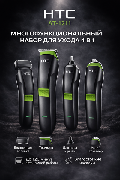Универсальные наборы для ухода за собой от HTC — это барбершоп у вас дома. Забудьте о множестве разных устройств, теперь всё, что нужно мужчине, есть в одном комплекте. Вариант 1: HTC AT-038 (3 в 1) — Синий Насадка для стрижки: Идеально ровняет бороду и усы. Триммер для носа и ушей: Безопасно удаляет нежелательные волосы. Точечный триммер: Для создания узоров и точной окантовки. Зарядка: Современный порт USB Type-C. Вариант 2: HTC Face & Body (4 в 1) — Зеленый Полный уход: Подходит для лица и тела (Face & Body Grooming). Шейвер: Сетчатая бритва для гладкого бритья под ноль. Триммер для тела: Специальная насадка для чувствительных зон. Универсальность: Сменные головки легко меняются одним движением. Преимущества серии: Острые лезвия из нержавеющей стали. Мощный аккумулятор для долгой работы. Компактный дизайн, удобно брать в путешествия. Сертификат качества ISO 9001.