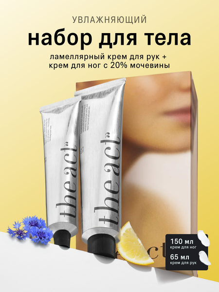 Набор The Act для интенсивного питания и увлажнения кожи рук и ног даже в самых сухих случаях. В мире, где солнечные лучи, стресс, токсичные примеси, сухой воздух и неудобная обувь диктуют свои правила, без увлажнения невозможно сохранять молодость и нежность кожи рук и ног. В наборе The Act собрались увлажняющие бестселлеры бренда. Крем для рук имеет ламеллярную основу, которая улучшает проникающую способность полезных компонентов и способствует длительной гидратации. Представьте, как ваши руки окутывает тонкая невесомая вуаль, которая совсем не ощущается и не жирнит ладони, но надолго защищает и питает восприимчивую к внешним воздействиям кожу рук. Так работает ламеллярная формула. Крем для ног содержит 20% мочевины, поэтому эффективно смягчает кожу ног и предохраняет от появления натоптышей и шелушений. Мочевина надолго удерживает влагу внутри и сама является натуральным увлажнителем. Она ускоряет заживление мелких ранок и трещинок, смягчает огрубевший слой кожи и улучшает впитываемость других полезных компонентов. Набор придёт в эстетичной упаковке, которая станет идеальным увлажняющим подарком для себя или близких. Сами продукты находятся в экологичной алюминиевой тубе. Лёгким нажатием можно отрегулировать нужную порцию для экономичного расхода. Как использовать? Наносите средства на очищенную кожу ног или рук массажными движениями каждый раз, когда требуется увлажнение. Рекомендовано к применению с 14 лет.