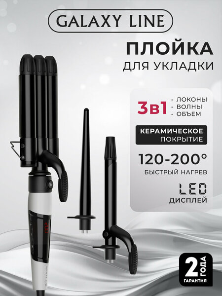 Набор для укладки волос Galaxy Line GL4703 - это многофункциональное устройство, которое позволяет создавать разнообразные прически быстро и легко. В комплект входят три насадки, каждая из которых предлагает новый тип стайлинга. Конусная насадка формирует воздушные волны с естественной динамикой, классическая насадка с зажимом помогает сделать четкие упругие локоны, а тройная насадка обеспечивает модный текстурный эффект и дополнительный объем. Температура нагрева регулируется в широком диапазоне от 120 до 200 градусов, а LED-дисплей позволяет точно отслеживать текущие параметры. Керамическое покрытие равномерно распределяет тепло и обеспечивает мягкое скольжение по волосам. Сетевой шнур длиной 1,8 метра не ограничивает движения, а встроенные системы безопасности, такие как автоотключение и защита от перегрева, делают использование набора максимально комфортным и надежным. Набор для укладки Galaxy Line GL4703 выполнен в стильном белом цвете, имеет петлю для подвешивания и индикацию включения. Наконечники щипцов не нагреваются, что делает использование устройства безопасным. В комплекте с набором для укладки вы получаете конусная насадка 9-19 мм для естественных объемных волн с плавным переходом, насадка с зажимом 19 мм для аккуратных, ровных и предсказуемых локонов, и тройная насадка 25 мм для стильной текстурированной волны и мгновенного объема.