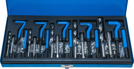 Набор включает в себя приспособления для восстановления резьбы с диаметром: M5 X 0.8 x 6.7 мм M6 X 1.0 x 10.8 мм M8 X 1.25 x 10.8 мм M10 X 1.5 x 13.5 мм M12 X 1.75 x 16.3 мм