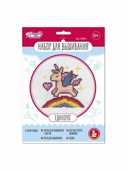 Набор для вышивания крестиком идеально подходит для тех, кто увлечен рукоделием. Он позволяет создать уникальную вышивку, развивая мелкую моторику, воображение, и творческое мышление. Готовая вышитая работа станет отличным подарком для близких. Рекомендуется для детей старше 5 лет. Перед началом работы обработайте края канвы, чтобы они не осыпались. Найдите центр канвы, сложив её дважды и отметив середину. Поместите канву в пяльцы, совместив центр с отметками на схеме. Отделите две нитки нужного цвета и вденьте их в иглу. Закрепите нить с изнаночной стороны, избегая узелков. На коробке есть схемы, объясняющие, как правильно вышивать. Этот набор для начинающих предлагает все необходимое для освоения вышивки крестиком, подходя как для детей, так и для взрослых. Вышивка мулине 26*26 см Единорог Десятое Королевство 04894. размер 26*26 см; тип вышивание; упаковка картонная коробка; Возраст 5+; европодвес да; Торговая марка: Десятое Королевство; Страна: россия; Упаковка: 14; Сертификат: 2847. Набор для вышивания «Единорог» создан специально для любителей мифических животных и рукоделия. С его помощью можно вышить необычного персонажа. В набор входят: игла пластиковая, белая канва – 1 шт. (26*26 см), нитки мулине 7 цветов (красный, оранжевый, желтый, зелëный, голубой, розовый, коричневый), цветная схема вышивки.