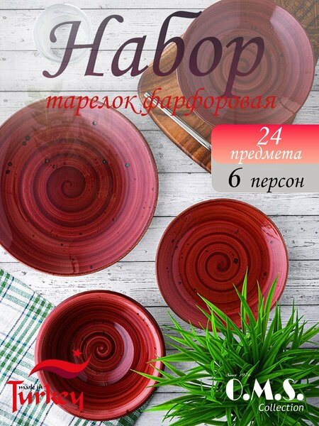 Набор фарфоровых тарелок, 24 предмета O. M. S, Алый