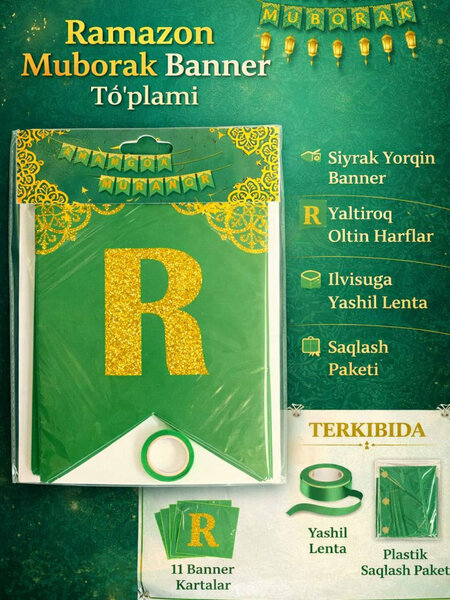 Набор декоративных флажков «Ramadan Mubarak» предназначен для украшения дома, зала или ифтарного стола в священный месяц Рамадан. Праздничная гирлянда с надписью «Ramadan Mubarak» создаёт тёплую, радостную и духовную атмосферу во время ифтара и семейных встреч. Флажки идеально подходят для оформления интерьера, окон, стен, дверных проёмов, праздничных столов и фотозон. Декор легко крепится, не требует специальных инструментов и может использоваться как в домашних условиях, так и в кафе, ресторанах или на мероприятиях. Набор станет отличным дополнением к праздничному оформлению на Рамадан и Ураза-байрам, а также прекрасным подарком для близких. Универсальный дизайн гармонично сочетается с другими элементами исламского декора и подчёркивает торжественность праздника.