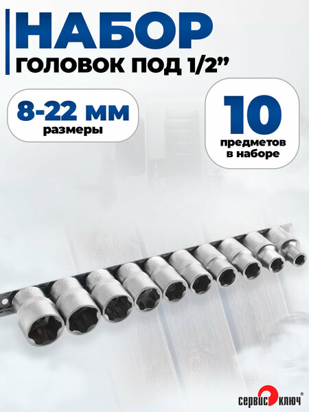Набор головок 8-22 мм под 1/2, 10 предметов, Сервис Ключ