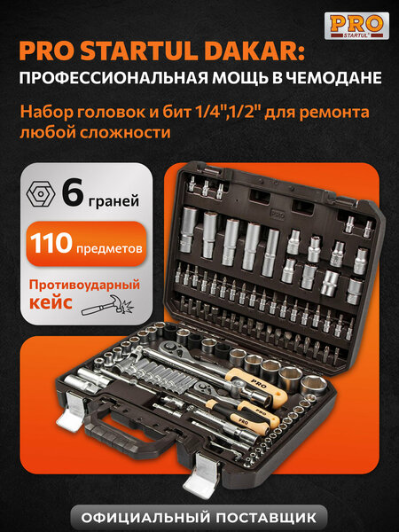Набор головок и ключей с трещоткой PRO STARTUL DAKAR (PRO-110DK) — незаменимый инструмент для автосервисов, автомастерских и автомехаников. Набор для автомобиля объединяет широкий спектр высококачественных инструментов, предназначенных для ремонта и технического обслуживания автомобилей любого уровня сложности. Преимущества набора: - В комплект входят головки 1/2", оснащённые усовершенствованным профилем, который работает с крепежом, грани которого скруглены на 85%, что увеличивает срок службы и уменьшает риски повреждения. - Плавающие удлинители позволяют отклонение до 10°. - В набор включены ударные головки, разработанные для работы с ударными инструментами в самых тяжелых условиях эксплуатации. - Эргономичные прорезиненные рукоятки снижают усталость рук и обеспечивают надежный захват. - Прочный кейс из противоударного пластика с металлическими замками и складной ручкой делает транспортировку и хранение максимально удобными и безопасными. Рабочие части изготовлены из прочной хромованадиевой стали 50BV30, которая устойчива к коррозии. Ударные головки (17, 19, 21 мм) выполнены из хромомолибденовой стали с повышенной прочностью и износостойкостью. Финишное покрытие — сатинирование, обеспечивающее защиту от коррозии и эстетичный внешний вид. Профиль головок — шестигранный, что гарантирует точное и надежное фиксацию крепежа. Комплектация включает: Головки торцевые 1/4" : 4, 4.5, 5, 5.5, 6, 7, 8, 9, 10, 11, 12, 13, 14 мм; Головки глубокие 1/4" : 6, 7, 8, 9, 10, 11, 12, 13 мм; Головки с отвертками типа E4–E8, а также насадки HEX, TORX, SL, PH и PZ для разнообразных работ; Головки торцевые 1/2" : 10–32 мм и ударные 17, 19, 21 мм; Головки глубокие 1/2" : 14–22 мм, свечные головки 16, 21 мм; Насадки 5/16" HEX, TORX, SL, PH, PZ; Трещотки 1/4" и 1/2" с механизмом из 72 зубьев для плавного и точного вращения; Плавающие удлинители, карданные соединения и переходники для увеличения диапазона применения. Крышка-органайзер для аккуратного хранения.