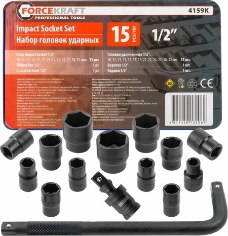 Набор головок ударных FORCEKRAFT 1/2"DR, 10-32мм, 6гр, в ложементе, 15 предметов