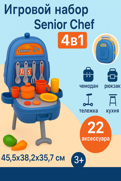 Senior Chef 4в1 – Настоящее кулинарное приключение для малышей! ✨ Уникальный игровой набор 4 в 1: Рюкзак — удобно брать с собой в дорогу! Чемоданчик — все аксессуары аккуратно хранятся внутри! Тележка — можно катать и играть в движении! Мини-кухня — готовь, как настоящий шеф-повар! В наборе 22 аксессуара: ложки, вилки, кастрюли, чашки, овощи и другие красочные детали! Яркий дизайн и насыщенные цвета привлекают внимание ребёнка и развивают воображение. Преимущества: ✅ Развивает мышление и мелкую моторику ✅ Стимулирует творческие способности ✅ Учит аккуратности и самостоятельности Размеры: 45,5 × 38,2 × 35,7 см Возраст: от 3 лет Senior Chef 4в1 — это не просто игрушка, а первая кулинарная школа вашего малыша! Идеи для стикеров: «4 в 1 Супер Набор!» «Мини-Кухня для Детей!» «Рюкзак + Чемодан + Тележка + Кухня» «22 Ярких Аксессуара!» «Подходит с 3 лет!» ✨ «Творчество и Радость в каждой детали!»