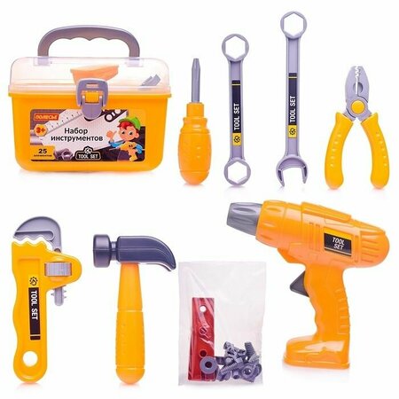 Наборы инструментов, производимые компанией "Полесье", могут использоваться как для проведения групповых занятий в дошкольных учреждениях, так и для самостоятельной игры ребенка. Все инструменты, входящие набор, функционально идентичны взрослым аналогам и позволяют развивать мелкую моторику, координацию ребенка, точность движений. Набор инструментов помогает познакомить детей с основными особенностями взаимодействия отдельных частей и деталей, развивает пространственное воображение. В наборе: ящик для инструментов; молоток; плоскогубцы; отвертка; дрель с инерционным механизмом; гаечные ключи; пять болтов; пять гаек; три детали с отверстиями; две насадки для дрели; Размер ящика: 21 х 16 х 15 см. Размер аксессуаров: 15 -20 см. Соответствует требованиям безопасности продукции. Для детей от 3-х лет. Материал: Пластик; Вид профессии: Строитель; Количество элементов: 25; Минимальный возраст ребенка: От 3 лет; Максимальный возраст ребенка: До 7 лет; Пол ребенка: Мальчики;
