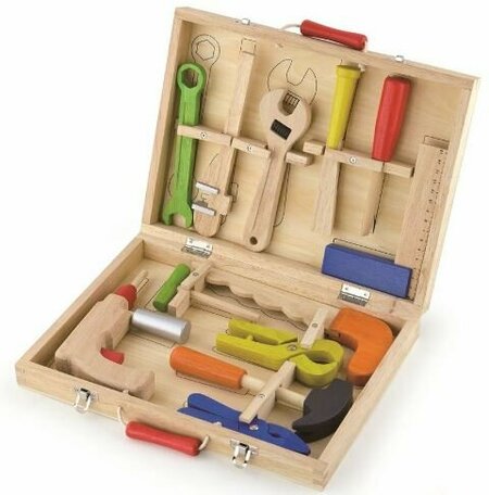 Набор игрушечных строительных инструментов, включает в себя 12 аксессуаров, необходимых для маленького мастера, в комплект входят: отвертка, молоток, гаечный ключ, рожковый ключ, разводной ключ, дрель, пилу, плоскогубцы, торцовый ключ, монтажный шпатель, щипцы. Все инструменты находятся в деревянной коробке, выполненной из лакированного дерева, окрашенной безопасными для ребенка красками в яркие цвета, которые порадуют любого пользователя.
