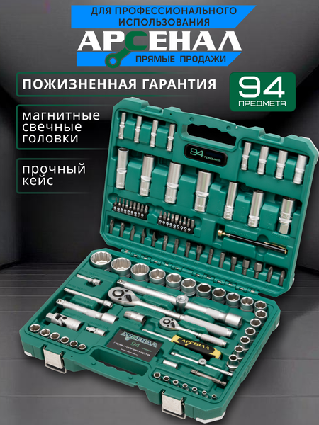 Набор инструментов 94 предмета Арсенал AA-C1412K94 - идеальное решение для автолюбителей, предпочитающих самостоятельно заниматься ремонтом. В этом наборе вы найдете все необходимые инструменты для выполнения большинства задач. Набор включает в себя практически полный комплект бит, головок и удлинителей к ним для ремонта большинства узлов и агрегатов современных авто. Помимо обычных головок, в комплекте присутствуют и глубокие в достаточном количестве. А большие головки на 27, 30 и 32 мм имеют 12-гранный удобный профиль. Биты поставляются в специальных плашках, что делает их удобными для переноски и предотвращает их потерю. Сталь, из которой изготовлен инструмент, легирована хромом и ванадием с нанесением никелевого покрытия. Крепкий кейс с металлическими углами выдержит ударные нагрузки. Наборы инструментов Арсенал имеют пожизненную гарантию. Арсенал - всегда качественный инструмент и надежные кейсы. Универсальный кейс с аксессуарами для авто можно использовать в гараже или взять в дорогу. Прекрасный подарок для мужчины. Подходит для отечественных машин, и любых иностранных марок. Производство Тайвань. В комплектации наборов Арсенал есть всё необходимое для авто. "1/4- Головки 6-гр: 4; 4.5; 5; 5.5; 6; 7; 8; 9; 10; 11; 12; 13; 14 (мм). Головки глубокие 6-гр: 6; 7; 8; 9; 10; 11; 12; 13 (мм). Трещотка 72 зуба. Вороток Т-образный 115 (мм). Удлинители wobble: 50; 100 (мм). Шарнир карданный. 1/2 Головки 6-гр: 10; 11; 12; 13; 14; 15; 16; 17; 18; 19; 20; 21; 22; 24 (мм). Головки 12-гр: 27; 30; 32 (мм). Головки глубокие 6-гр: 15; 17; 19, 22 (мм). Головки свечные магнитные 6-гр: 14, 16; 21 (мм). Трещотка 72 зуба. Удлинители wobble: 125; 250 (мм). Переходник скользящий: 1/2(П) на 3/8(М). Шарнир карданный. Биты: 5/16- SL: 8; 10; 12. PH: 3; 4. PZ: 3; 4. Hex: 7; 8; 10; 12; 14. Torx: 40; 45; 50; 55. Адаптер. 1/4- SL: 4; 5.5; 6.5. PH: 1; 2. PZ: 1; 2. Hex: 3; 4; 5; 6. Torx: 8; 10; 15; 20; 25; 27; 30. Адаптер. Отверточная рукоятка. Магнитная телескопическая ручка. Переходник под электроинструмент: 1/4.