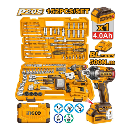 Набор ручных инструментов INGCO HKTHP31521 - это многофункциональный комплект, включающий в себя 152 предмета. Он предназначен для аккумуляторного ударного гайковерта, который обеспечивает высокую скорость и мощность работы. Гайковерт обладает напряжением 20 В и квадратным приводом 1/2". Скорость холостого хода составляет 0-1200/0-1800/0-2200 об/мин, а частота ударов - 0-2400/0-2800/0-3300 уд/мин. Момент затяжки и момент отвинчивания гаек достигают 500 Нм и 650 Нм соответственно. В комплект входят 13 торцевых головок 1/4", 18 штук торцевых головок 1/4" x 32, 4 глубокие торцевые головки 1/4" Dr. 50 мм, удлинитель 1/4" Dr. x 50 мм, рукоятка-спиннер 1/4" x 150 мм, универсальный шарнир 1/4", трехсторонний адаптер 1/4": 3/8" (F) x 1/4" (M), держатель бит 1/4" x 6,35 мм, 40 штук бит 6,35 x 25 мм, трещоточный ключ 1/2", универсальный шарнир 1/2", 7 торцевых головок 1/2", 2 свечные головки 1/2" 16-21 мм, 2 удлинителя 1/2" x 125 мм и 1/2" x 250 мм, трехсторонний адаптер 1/2": 3/8" (F) x 1/2" (M), 10 шестигранных головок 3/8", 4 глубокие шестигранные головки 3/8", 7 звездообразных головок 3/8", трещоточный ключ 3/8", 2 удлинителя 3/8" x 75 мм и 150 мм, универсальный шарнир 3/8", трехсторонний адаптер 3/8": 3/8" (F) x 3/8" (M), ключ для масляного фильтра, 2 отвертки: SL6.5x150