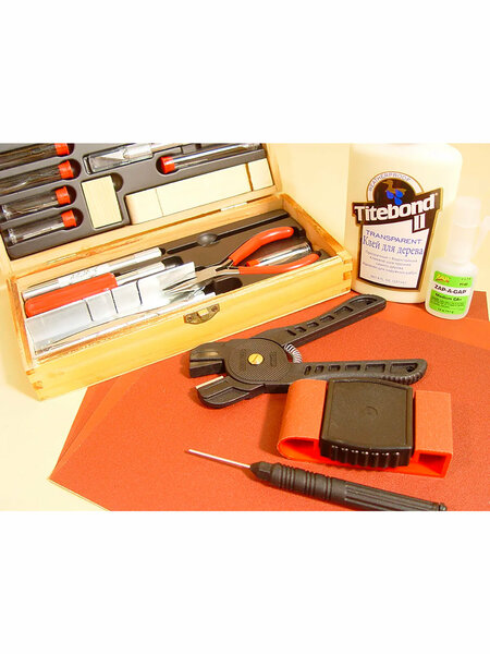 набор инструментов (ножи, лезвия, сверла, пинцет, стусло, пилку, узкогубцы. Упаковано в приятную деревянную коробочку);