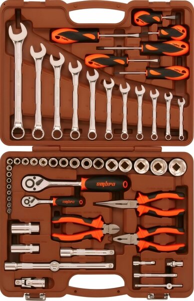 Набор инструментов Ombra OMT55S (55005) - 55 предметов, 15 видов инструментов, высоколегированная сталь, эргономичные рукояти, прочный пластиковый кейс, специальные отсеки для каждой детали