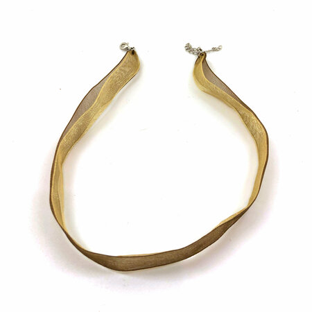 Шнур из органзы. Две полоски золотистого оттенка соединены между собой металлическим захватом серебряного цвета. Имеется дополнительная цепочка для удлинения шнура. Замочек карабин из металла серебряного цвета. Минимальная длина 36 см. максимальная 40 см. Ширина полоски 1см. В комплекте 3 шт. Индия.