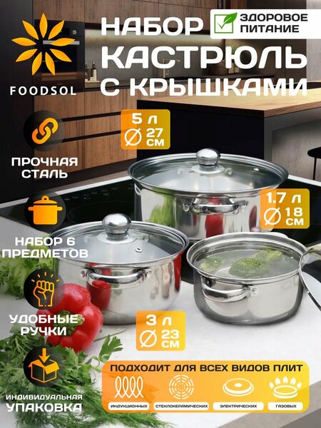 Набор кастрюль с крышками из нержавеющей стали 1,7 л, 3 л и 5 л — универсальная посуда для кухни для ежедневного приготовления супов, гарниров, каш и компотов. Оптимальные объёмы делают этот набор кастрюль удобным для семьи и подходят для разных задач на кухне. Кастрюли выполнены из стали, оснащены стеклянными крышками и подходят для всех типов плит. Набор кастрюль с крышками для индукционной плиты обеспечивает равномерный нагрев и комфорт в использовании. Практичное решение для тех, кто ищет набор посуды из нержавеющей стали, кастрюли с крышкой и функциональную посуду для дома. Если вы ищете набор кастрюль для кухни, набор кастрюль из нержавейки и удобный комплект для повседневной готовки, этот вариант станет полезным дополнением вашей кухни. Внимание! В комплекте идут дополнительные ручки для крышек на случай если при транспортировке товара до клиенты они были повреждены.
