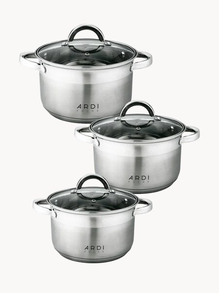 Представляем новый набор кастрюль ARDI KÜCHE AR-620, который станет незаменимым помощником в приготовлении ваших любимых блюд. Этот набор идеально сочетает в себе стильный дизайн и высокое качество, что делает его отличным решением для любой кухни. Кастрюли из нержавеющей стали позволяют готовить вкусную и здоровую пищу, а легкость в уходе освободит больше времени для себя и семьи. В набор входят кастрюли различных объемов - 2,2 л, 3 л и 4 л, вы можете выбрать идеальный размер для любого блюда. В кастрюлях из нержавеющей стали можно варить абсолютно все: супы, бульоны, пасту, крупы и овощи. Даже кислые варенья, компоты и морсы. Нержавеющая сталь не вступает в реакции с кислотами из фруктов и ягод, а потому опасных для здоровья соединений не образует. Эти изделия подходят для всех типов плит, включая индукционные, что делает их идеальными для современных кухонь. К тому же, кастрюли прекрасно сочетаются с другими предметами кухонной утвари, такими как сковороды, сотейники и посуда для запекания. Вы можете легко комбинировать их с вашей любимой посудой. А еще кастрюли удобны в хранении, сложив их «матрешкой» (кастрюли вставляются друг в друга) они не будут занимать много места на вашей кухне. Не забывайте и о функциональности! Набор включает кастрюли с крышками, что позволяет вам готовить на пару и сохранять полезные вещества в продуктах. А стильный внешний вид делает его не только практичным, но и красивым дополнением к вашему кухонному интерьеру. Благодаря разнообразию вариантов эти кастрюли могут стать отличным подарком на любой праздник. Приобретая набор AR-620, вы получаете не только качественную посуду для кухни, но и возможность наслаждаться процессом приготовления. Удобные не нагревающиеся ручки делают использование кастрюль комфортным, а их стильный дизайн добавляет элегантности вашей кухне. Закажите наш набор кастрюль уже сегодня и наслаждайтесь готовкой с удовольствием! Мы не только продаем эти прекрасные кастрюли, мы являемся производителем товаров бренда ARDI KÜCHE и предоставляем гарантию на весь ассортимент бренда – 1 год. Уважаемые покупатели, обратите внимание: полезный объем – 1,5 л, 2 л, 3 л. Для сохранения первоначального вида и блеска изделия при очистке посуды используйте только мягкие ткани. Не используйте абразивные чистящие средства.