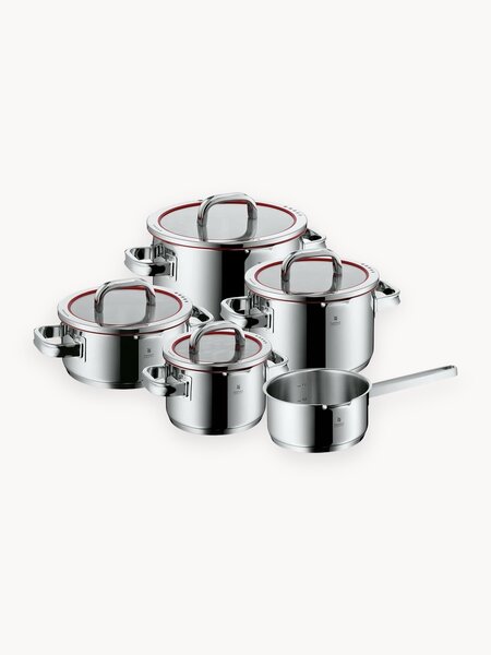 Коллекция кухонной посуды WMF Function 4 разработана в сотрудничестве с дизайнерским бюро NOA Aachen, а источником вдохновения для дизайна крышек стал MP3-плеер Apple iPod. Крышки изготовлены из нержавеющей стали и термостойкого силикона и выполняют четыре различные функции по аналогии с кнопками управления iPod: в зависимости от положения крышки вы можете удобно сливать жидкость из кастрюли полностью или частично, не снимая её. Большие и маленькие отверстия в виде сита позволяют сливать воду с пасты или риса, отверстие без сита — полностью выливать жидкость из кастрюли, а закрытое положение — готовить с небольшим количеством воды внутри. Яркое силиконовое кольцо, которое расположено по контуру крышки, обеспечивает её надёжное и плотное прилегание к кастрюле. Термоизолированные полые ручки остаются холодными во время приготовления, однако при длительном нагреве и приготовлении в духовке вам понадобятся прихватки. Корпус кастрюль выполнен из высококачественной и долговечной нержавеющей стали Cromargan, а на внутренней поверхности стенок расположена удобная мерная шкала для измерения количества жидкости. Посуда оснащена универсальным дном TransTherm, которое гарантирует быстрый нагрев и длительное сохранение тепла, поэтому её можно использовать на всех типах плит, включая индукционные. Во вставке-пароварке овощи готовятся быстрее и получаются более полезными и вкусными, чем при обжаривании в масле — процесс приготовления на пару помогает сохранить основные питательные элементы и натуральный вкус продуктов. Cromargan — это нержавеющая сталь со следующим составом:- 18 % хрома для устойчивости к корозии;- 10 % никеля для непревзойдённого блеска и устойчивости к кислотам;- 72 % стали высочайшего качества. В набор входят предметы:- ковш 16,0 см, 1,4 л;- кастрюля с крышкой 16,0 см, 1,9 л;- кастрюля с крышкой 20,0 см, 3,9 л;- кастрюля с крышкой 24,0 см, 5,7 л;- вставка-пароварка 20,0 см.