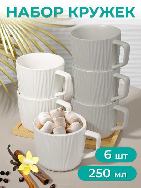 Набор керамических чашек от MILAND: стиль и комфорт на вашей кухне Элегантный дизайн и высокое качество Керамические чашки представляет собой стильное и практичное решение для вашей кухни. Сочетание белого и серого цветов придает чашкам современный и элегантный вид, который будет гармонично смотреться в любом интерьере. Удобство и функциональность Каждая чашка имеет объем 250 мл, что позволяет наслаждаться любимыми напитками в достаточном количестве. Классический дизайн чашек подходит для любого напитка, будь то кофе, чай или горячий шоколад. Набор состоит из 6 чашек, что обеспечивает достаточное количество посуды для сервировки стола. Размер чашек составляют 11.5х8.7х7 см, что делает их удобными для использования и хранения. Выбирая набор керамических чашек от MILAND, вы получаете не только стильный и практичный аксессуар для вашей кухни, но и возможность наслаждаться любимыми напитками в комфортной и приятной обстановке.