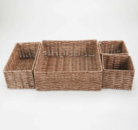 Пластиковые корзинки для хранения. Косметические емкости изготовлены из пластика - материала подходящего для влажных помещений. Обратите внимание: В наборе представлены: корзина 24х24х8,5 см, корзина 22х11х8 см, 2 корзины 11х11х8 см. Материал: Пластик Крышка: Нет Колеса: Нет Ручки: Нет Цвет: Бежевый-коричневый Рисунок: Нет Марка: elemento Страна производства: Китай Вес брутто (кг/компл) : 0.429