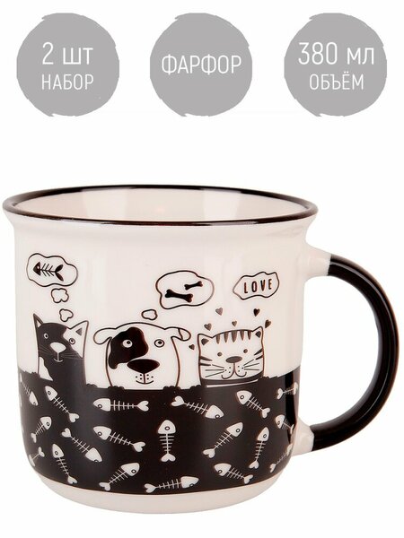 Набор кружек 2 шт "Сat&dog", 380 мл, Nouvelle Дополнительные подробности: Не использовать абразивные чистящие средства. Комплектация: кружка - 2 шт Рекомендации по использованию: СВЧ - да. ПММ - да. Размер штуки: 12,5х9,5х9 см Размер товара в упаковке: 21х11х11 см Материал: Фарфор. Вид упаковки: картонная коробка. Фарфоровая кружка 380 мл может использоваться для чая и кофе, молока и компота, холодных и горячих напитков. Может использоваться как: чайная чашка, кофейная чашка, керамическая чашка, набор чашек 2 шт.
