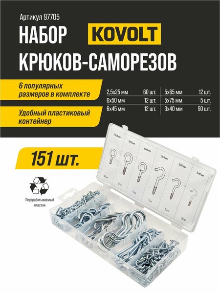 Набор крюков-саморезов KOVOLT включает в себя 151 шт. различных размеров, что позволяет выбрать оптимальный вариант для выполнения различных строительных работ. В комплекте представлены следующие размеры крюков-саморезов: 2,5x25 мм (60 шт.), 6x50 мм (12 шт.), 6x45 мм (12 шт.), 5x65 мм (12 шт.), 5x75 мм (5 шт.), 3x40 мм (50 шт.). Все крюки-саморезы упакованы в удобную и прочную кейс-сумку, которая обеспечивает безопасное хранение и транспортировку инструментов. Вес с упаковкой составляет 571 г.
