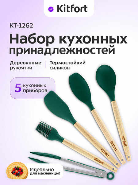 Всё для кулинарных шедевров Кухонный набор КТ-1262 станет отличным дополнением к любой кухне, делая процесс приготовления пищи комфортным и эффективным. В него входят подставка и пять аксессуаров: кулинарный шпатель, половник, ложка для выпечки, кисточка и щипцы. Кулинария с лёгкостью и стилем! Кулинарный шпатель идеально выровняет крем и распределит глазурь. Половник отлично подойдёт для разливания жидких блюд по тарелкам или для поливания десертов сиропом. А ложка для выпечки с гибким краем аккуратно перенесет готовые лакомства. Инструменты для настоящих кулинаров! Кисточка нужна для смазывания выпечки яйцом, формы маслом или бисквита сиропом. Щипцы облегчают переворачивание и извлечение продуктов. У них есть фиксатор: нажмите для раскрытия, сожмите и потяните для фиксации в закрытом положении. Удобно, надёжно, безопасно Аксессуары изготовлены из безопасного силикона, который не впитывает запахи и не царапает поверхности. Большинство предметов, кроме щипцов, оснащены деревянными ручками, которые не нагреваются и защищают от ожогов. Для тех, кто ценит комфорт и порядок! Компактная и стильная подставка позволяет легко хранить все предметы вместе, экономя место на кухонном столе или полке. Отверстия на каждом предмете обеспечивают их надёжное подвешивание на крючок. Легко мыть Мойте кухонные принадлежности в тёплой воде сразу после использования, не допуская засыхания остатков пищи. Используйте мягкую губку и средство для мытья посуды. Тщательно высушите их после чистки. Учтите, что мытьё в посудомоечной машине запрещено.