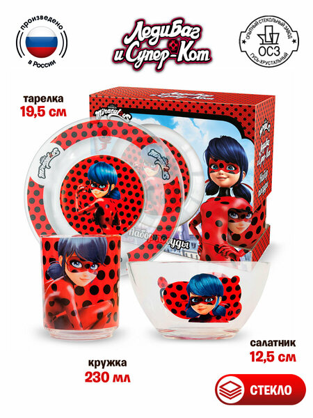 Подарочный набор посуды для детей с изображением Леди Баг из любимого мультфильма "Леди Баг и Супер Кот" подарит незабываемые моменты за приемом пищи и поднимет настроение каждому маленькому гурману! Этот детский набор посуды, выполненный по официальной лицензии, включает три предмета: плоскую тарелку (диаметр 19,5 см), салатник (объем 380 мл) и кружку (230 мл). Изготовленная из прозрачного стекла, эта красивая посуда в подарок станет отличным выбором для любого случая — будь то Новый год, День рождения или 8 марта. Яркие цвета и стильный декор с изображением Чудесной Леди Баг делают этот набор посуды детским настоящим произведением искусства! Набор детской посуды для кормления украшен не только привлекательным дизайном, но и надежной подарочной упаковкой — красочной коробкой, из боковины которой ребенок сможет вырезать закладку с любимой героиней. Набор посуды для детей не только радует глаз, но и делает процесс кормления настоящим праздником! Однако стоит помнить, что стеклянная посуда не подходит для использования в посудомоечной машине и СВЧ-печи. Чтобы сохранить яркий рисунок, рекомендуется избегать жестких моющих средств и не подвергать посуду длительному воздействию солнечных лучей. Набор посуды детский стеклянный "Леди Баг" — это идеальный выбор для любого малыша, который оценит как красоту, так и функциональность своей новой посуды для кормления. Порадуйте своего ребенка этой удивительной посудой и сделайте каждый прием пищи веселым и запоминающимся.