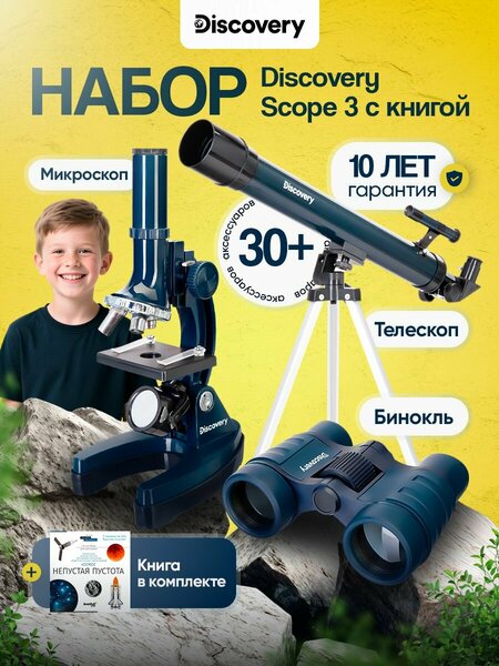 Набор из трех оптических приборов: телескопа, микроскопа и бинокля. В комплекте более 30 аксессуаров и познавательная книга о космосе В набор Discovery Scope 3 входят три оптических прибора для начинающих пользователей: биологический микроскоп с нижней подсветкой, телескоп на полноразмерной треноге и компактный бинокль. Также в комплект включены более 30 аксессуаров и книга знаний «Космос. Непустая пустота». Набор станет отличным подарком тому, кто увлечен изучением окружающего мира и хочет научиться пользоваться оптической техникой. Телескоп-рефрактор на азимутальной монтировке Телескоп из набора Discovery Scope 3 подойдет для первого знакомства с телескопами и астрономическими наблюдениями. С его помощью можно научиться наводить оптическую трубу на небесные объекты, проводить фокусировку, рассматривать детали Луны. Телескоп также можно использовать по наземным объектам – как мощную зрительную трубу. В комплектацию включены все необходимые аксессуары, которые позволят незамедлительно приступить к исследованиям космоса и окружающего мира. Еще один помощник в изучении астрономии – книга знаний «Космос. Непустая пустота». Это иллюстрированное обучающее пособие, которое знакомит с основами: что такое телескоп, как называются его основные компоненты, как правильно проводить наблюдения, что ни в коем случае нельзя делать и проч. Кроме советов, в книге вы найдете справочную информацию о популярных астрономических объектах: Солнце, планетах и их спутниках, метеорных дождях и кометах, далеких звездах. Книга написана простым языком, не перегружена терминами. Микроскоп для изучения прозрачных образцов Биологический микроскоп, включенный в набор, предназначен для изучения прозрачных образцов. Это могут быть жизнь в капле воды, готовые микропрепараты или самостоятельно изготовленные тонкие срезы. Для создания образцов и проведения несложных микробиологических опытов в комплект включено все необходимое. Микроскоп дает увеличение в диапазоне от 150 до 900 крат, оборудован сдвоенной нижней подсветкой. В одном положении осветитель – это зеркало, которое удобно использовать при наличии достаточного внешнего освещения. В другом положении начинает работать лампочка накаливания. Она питается от батареек. Компактный и легкий бинокль Бинокль Discovery Scope 3 дает 4-кратное увеличение и идеально подходит для изучения окружающего мира в солнечный день. Легкий и небольшой, он не обременит в дороге и позволит рассмотреть интересный объект вдали или летящую птицу в небе. Этот бинокль стоит взять с собой на прогулку, в зоопарк или в поездку в другой город – яркие впечатления будут обеспечены! Набор идеально подходит в качестве подарка на Новый Год! Основные особенности: