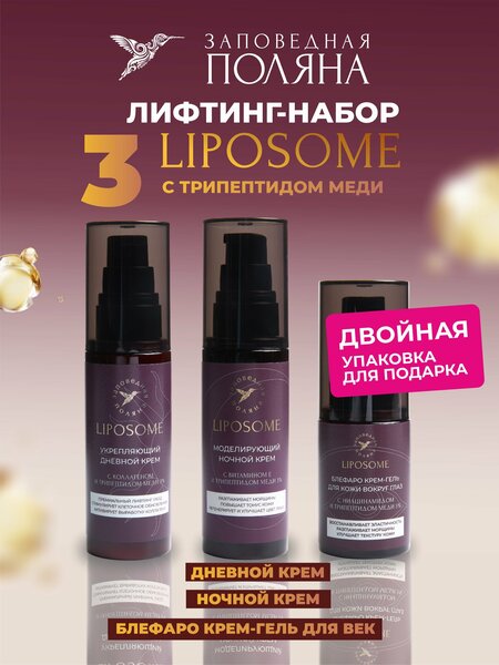 Набор из трёх средств антивозрастного ухода «Заповедная поляна» включает дневной крем, ночной крем для лица и блефаро крем-гель для век. Продукты идеальны для антиэйдж программы ухода 40+ 50+ 55+ 60+ 70+. Вместе они помогают уменьшить выраженность морщин, поддержать упругость кожи и заботятся о нежной области вокруг глаз. Дневной крем увлажняет и защищает кожу в течение дня, ночной крем питает и поддерживает процессы восстановления, а крем-гель для век помогает снять следы усталости и уменьшить заметность мелких морщинок. Продукты рекомендованы для нормальной, сухой и комбинированной кожи, а также при повышенной чувствительности и признаках купероза; средство некомедогенное. В формулах линейки LIPOSOME мы используем высокоактивный раствор трипептида меди с концентрацией 1000 ppm. Его ввод в продукт на уровне 3% и 5% в разных средствах позволяет добиться оптимальной, по-настоящему рабочей концентрации для выраженного Anti age-эффекта. Удобен как готовое решение для повседневного ухода или в качестве подарка.