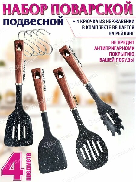 Стильный поварской набор из прочного высокотехнологичного жаропрочного пластика различной комплектации от 4 до 6 предметов в наборах. Уникальность кухонных приборов состоит в том, что каждая надежная мощная ручка оснащена так называемыми ножками, которые не позволяют рабочей части ложки, лопатки или шумовки касаться стола если положить прибор горизонтально, ручка тяжелее и рабочая часть как бы повисает в воздухе, тем самым не пачкает стол. Всего 6 уникальных разных кухонных поварешек: лопатка кухонная 35 см ширина 10 см, лопатка шумовка 35 см ширина 10 см, шумовка широкая 35 см ширина 11 см, ложка кухонная 34 см ширина 7 см, ложка со сливом 34 см ширина 7 см, ложка для спагетти 34 см ширина 7 см - в наборах встречаются различные варианты комплектации этих предметов, а так же можно купить поварёшки и по штучно. В каждом комплекте имеются S-образные крючки из нержавеющей стали, количество крючков кратно количеству приборов в наборе. Ручки кухонных приборов выполнены из термостойкого и ударопрочного, невероятно удобного в использовании пластика, очень приятные на ощупь и удобные в эксплуатации! Кухонные приборы VDOMBERI очень популярны и зарекомендовали себя в профессиональной среде поваров. С уверенностью можно сказать - добротный надёжный поварской набор станет незаменимым помощником каждой хозяйке, которая любит готовить и закроет все возможные потребности в кухонных аксессуарах! Набор кухонных принадлежностей из термостойкого полипропилена - комплект поварских приборов из пластика, аксессуары кухонные, разно функциональные предметы: шумовка, ложка поварская, ложка с отверстием для слива, ложка для спагетти, лопатка с отверстиями, широкая лопатка кухонная. Кухонная утварь, инвентарь для кухни в наборе изготовлен на крупнейшей фабрике в Китае, которая производит посуду для многих известных брендов и зарекомендовала себя как производитель качественных кухонных и столовых приборов, а так же профессиональной посуды для приготовления пищи, различных горячих блюд в кастрюле или сковороде, казане или противне, и утвари для сервировки стола. Стильный красивый набор можно повесить на рейлинг на S-образные крючки, которые входят в комплект, комплект подвесных поварёшек впишется в любой интерьер! Приспособления для готовки еды хороши для использования на кухне дома, в квартире или на даче! поварешки можно положить и в ящик стола органайзер под столешницу, или в кухонный шкаф или купить подставку под столовые и поварские инструменты. Крючок надежный держатель в форме буквы S так же произведён из стали 18/10 В нашем ассортименте представлены и другие наборы кухонных поварских приборов другого дизайна и комплектации. Ложки, лопатки, половники и шумовки для кухни могут стать прекрасным подарком, кухонная утварь VDOMBERI как опытным хозяйкам так и просто любителям приготовить своими руками вкусное блюдо для близких людей. Подарок маме, жене, сестре, бабушке, подруге, девушке, коллеге, любимой женщине на любой праздник: новый год, Рождество, 8 марта, пасху, день влюблённых, в день рождения или именины! Очень недорогие поварёшки для кастрюль и лопатки для сковороды будут полезны и востребованы в каждой семье! Приятного аппетита!