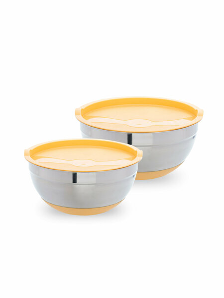 Набор мисок металлических с крышками Tiger, 2 шт. Объем: 1,5 л и 2,4 л (диаметр 21 см, высота 12 см), Миски стальные с крышкой - незаменимая вещь для любой хозяйки. Нержавеющая сталь надежна в использовании, за ней просто ухаживать, можно мыть в посудомоечной машине. Силиконовое дно не позволяет мискам скользить по поверхности, поэтому они идеально подходят для смешивания продуктов вручную или миксером. Миски обладает функцией хранения продуктов благодаря плотно прилегающей силиконовой крышке. Материал мисок: нержавеющая сталь. Материал крышек: пластик. Можно мыть в посудомоечной машине. Страна производства: Китай.