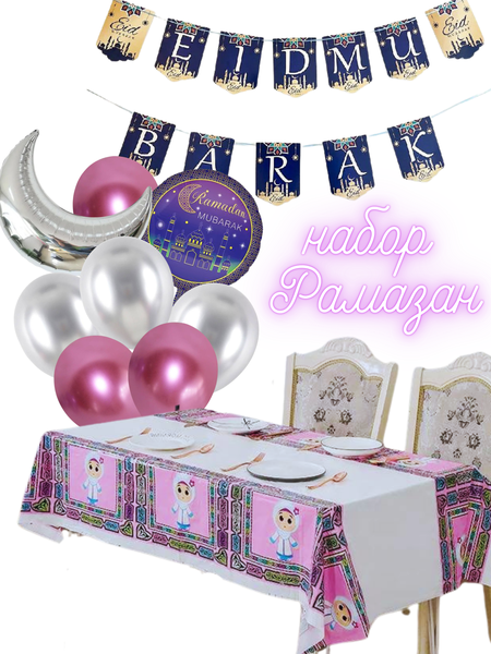1 Фольгированный круг 45см. 1 Фольгированная луна 60 см. 3 серебряных шара 12 дюймав-30 см. 3 бордовых шара 12 дюймов-30 см. 1 клеенчатая скатерть в стиле eid mubarak 180*100см, 1 растяжки eid mubarak (размер регулируется).