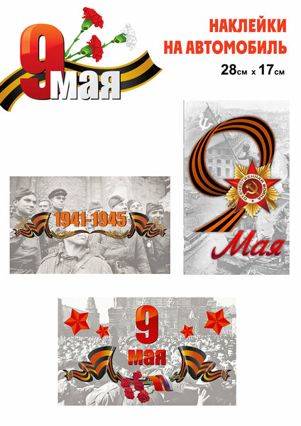 Набор наклеек на автомобиль "9 Мая" от Медный всадник - это патриотичный и яркий аксессуар для вашего автомобиля, который поднимет настроение и напомнит о подвиге дедов и прадедов. Изготовленные из пленки ПВХ, наклейки устойчивы к температурам от +40° до -40°С, обеспечивая их долговечность и сохранность внешнего вида на протяжении всего срока службы. Комплект состоит из трех наклеек размером 28 х 17см. Они могут быть установлены на стекло или кузов автомобиля, а также внутри салона. Благодаря клеевому слою, наклейки легко крепятся на любую гладкую поверхность, не оставляя следов после удаления. Выбирая набор наклеек на автомобиль "9 Мая", вы делаете свой автомобиль более привлекательным и уникальным, а также выражаете свою любовь и уважение к истории и подвигу нашего народа.