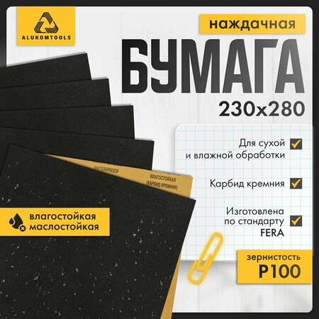 Наждачная бумага набор 10шт, для сухой и влажной обработки, P 100, 23 х 28 см, ALUKOMTOOLS