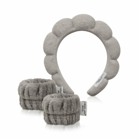 Набор спонжевый ободок и напульсники серого цвета, для умывания в мешочке. Уникальный дизайн ободка визуально подчеркивает форму головы и придает дополнительный объем волосам. Надевайте его в ежедневном рутинном уходе за лицом, макияже, а также при занятиях йогой или пижамной вечеринке. Абсорбирует воду при умывании. Мягкий спонж и материал терри комфортен в носке, не сминает волосы и не сдавливает голову. Не скользит по волосам. Напульсники на запястье из микрофлиса прекрасно абсорбируют воду при умывании. Вода не будет стекать до локтей. Набор в мешочке для хранения и стирки. Стирать в холодной воде на деликатном режиме без отжима.