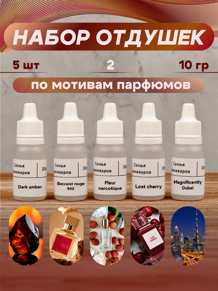 Создание уникального аромата для вашего дома или любимых косметических средств станет невероятно простым с нашим набором отдушек для свечей и диффузоров. Этот продукт идеально подходит как для профессиональных мастеров, так и для тех, кто только начинает заниматься мыловарением, изготовлением свечей и других изделий. Набор включает в себя 5 отдушек по 10гр во флаконах с удобным дозатором, что обеспечит удобство в использовании и поможет вам точно дозировать ароматизаторы. Состав набора отдушек "По мотивам парфюмов 2" -Dark amber -Baccarat rouge 540 -Fleur narcotique -Lost cherry -Magnificently Dubai Наш комплект включает в себя жирорастворимые отдушки, которые прекрасно подходят для приготовления бомбочек, контейнерных и формовых свечей, аромасаше, диффузоров, рум-спреев, и даже для духов. Также могут подойти для мыла с нуля, но необходимо тестировать. Каждая косметическая отдушка в этом наборе обладает своим уникальным характером, что позволяет создавать разнообразные изделия. Выбирая отдушку для диффузоров, вы получаете возможность создать нечто большее, чем просто аромат. Это ваш шанс выразить свою индивидуальность и создать уникальную атмосферу в вашем доме. Попробуйте наш продукт и убедитесь сами, как легко и просто можно привнести в свою жизнь атмосферу уюта и тепла! Не упустите возможность сделать каждый момент особенным — приобретайте наш набор уже сегодня.