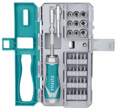 Набор отверток TOTAL TACSD30336 - это профессиональный инструмент, который включает в себя 33 предмета. Он предназначен для использования в строительстве, ремонте и других работах, где требуется точность и надежность. Набор включает в себя 20 бит с различными шлицами: прямой (SL), крестообразный (PH), Torx (T/TX), шестигранный (H/HEX), Pozidriv. Это позволяет работать с различными видами крепежа и материалов. В комплекте также 9 торцевых головок с шестигранным наконечником, что обеспечивает надежное крепление и исключает проскальзывание. Все инструменты удобно хранятся в прочном кейсе, который также служит сумкой для переноски. Это позволяет всегда иметь под рукой необходимые инструменты и не беспокоиться о их сохранности. Вес набора составляет всего 0,55 кг, что делает его легким и удобным для переноски. В набор также входят рукоять для головок, рукоять для бит, ключи имбусовые (шестигранные), а также аксессуары для хранения и переноски инструментов. Бренд TOTAL зарекомендовал себя на рынке как производитель надежных и качественных инструментов.