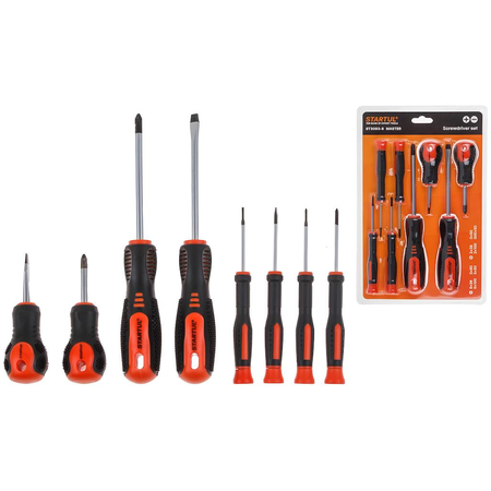 Набор отверток PH SL STARTUL Master 8 предметов (ST3093-8) представляет собой профессиональный инструмент, предназначенный для монтажа и демонтажа резьбовых соединений. и Набор включает в себя 8 различных типов отверток с различными типами наконечников Phillips (PH) и Slotted (SL): отвертки SL6x100, SL6x38, SL3x50, SL2x50, PH2x100, PH2x38, PH0x50, PH000x50. Стержень отверток изготовлен из хромванадиевой стали (Cr-V) с твердостью HRC 52-58, что обеспечивает высокую прочность и долговечность инструмента. Материал гарантирует отличную устойчивость к коррозии и износу, что делает его незаменимым помощником в любых условиях. Рукоятки отверток выполнены из двухкомпонентного материала Anti-Slip, который обеспечивает надежный хват и предотвращает скольжение инструмента из рук. Это делает работу с отвертками более комфортной и безопасной. Магнитные наконечники отверток облегчают работу с мелкими деталями и обеспечивают более точное позиционирование инструмента. В целом, набор отверток магнитных PH SL STARTUL Master 8 предметов (ST3093-8) является отличным выбором для профессионалов и любителей, ценящих качество, надежность и функциональность инструмента.
